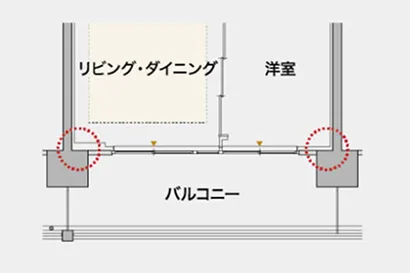 2.5m以上の天井高や連窓サッシの明るさ、奥行き2mのガラス手摺バルコニーの抜け感が、室内にのびやかなひろがりを生み出します。