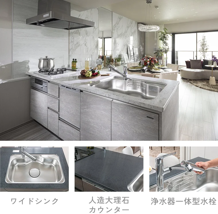 さらに、壁をなくしたキッチンや、柱を室外に出す設計により、視覚的にも機能的にもゆとりある空間を追求しています。※物件により異なります。