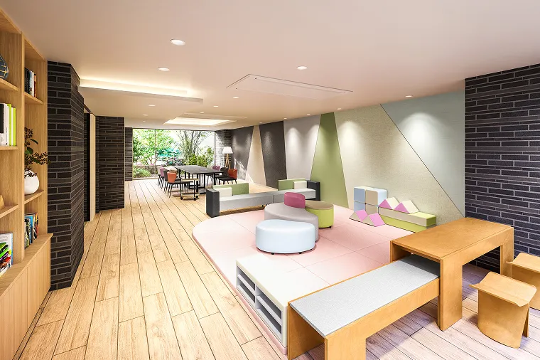雨の日も元気いっぱいに遊べる「プレジャーフィールド」。ブックシェルフや見守りスペースを設け、家族や友人と寛げる空間。