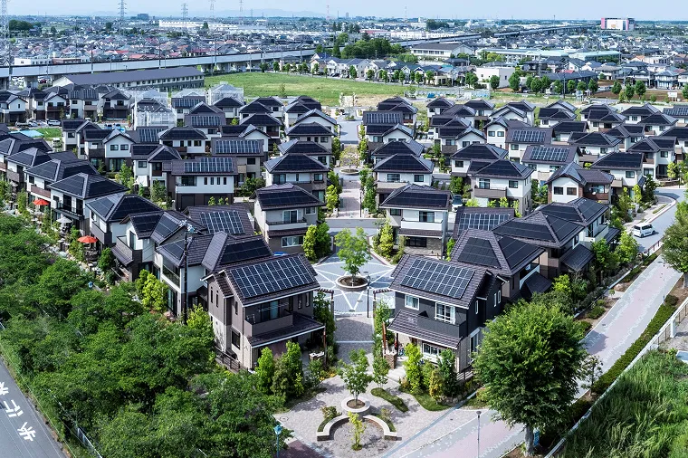 戸建街区の分譲住宅では、断熱性の高い住まいをベースに、高効率エアコンやLED照明などの省エネシステム、太陽光発電をはじめとする創エネシステムと、それらをコントロールするHEMSを活用。