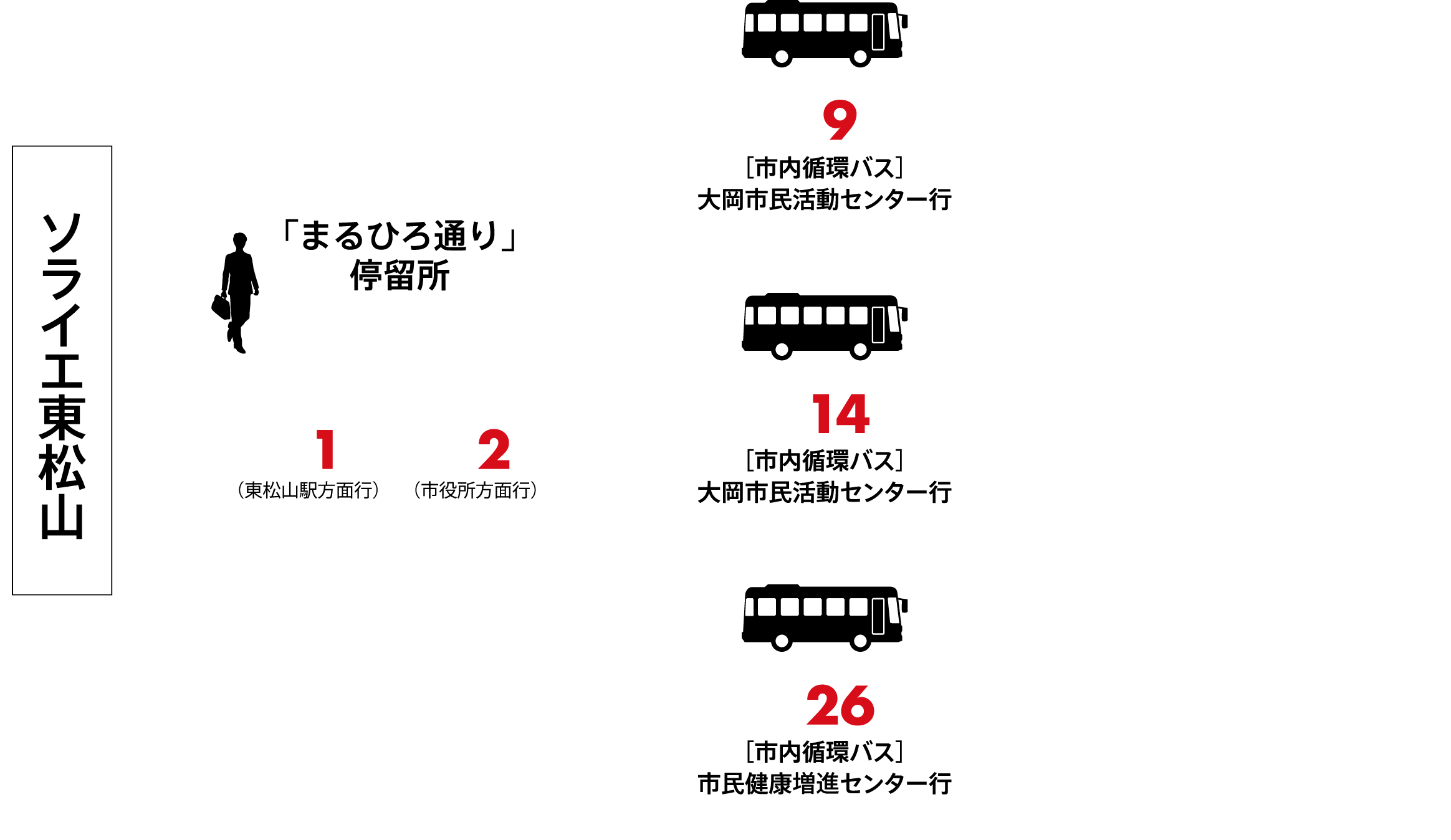 現地間近の「まるひろ通り」停留所(東松山駅方面行:徒歩1分/約30m・市役所方面行:徒歩2分/約100m)から市内循環バスが利用可能。