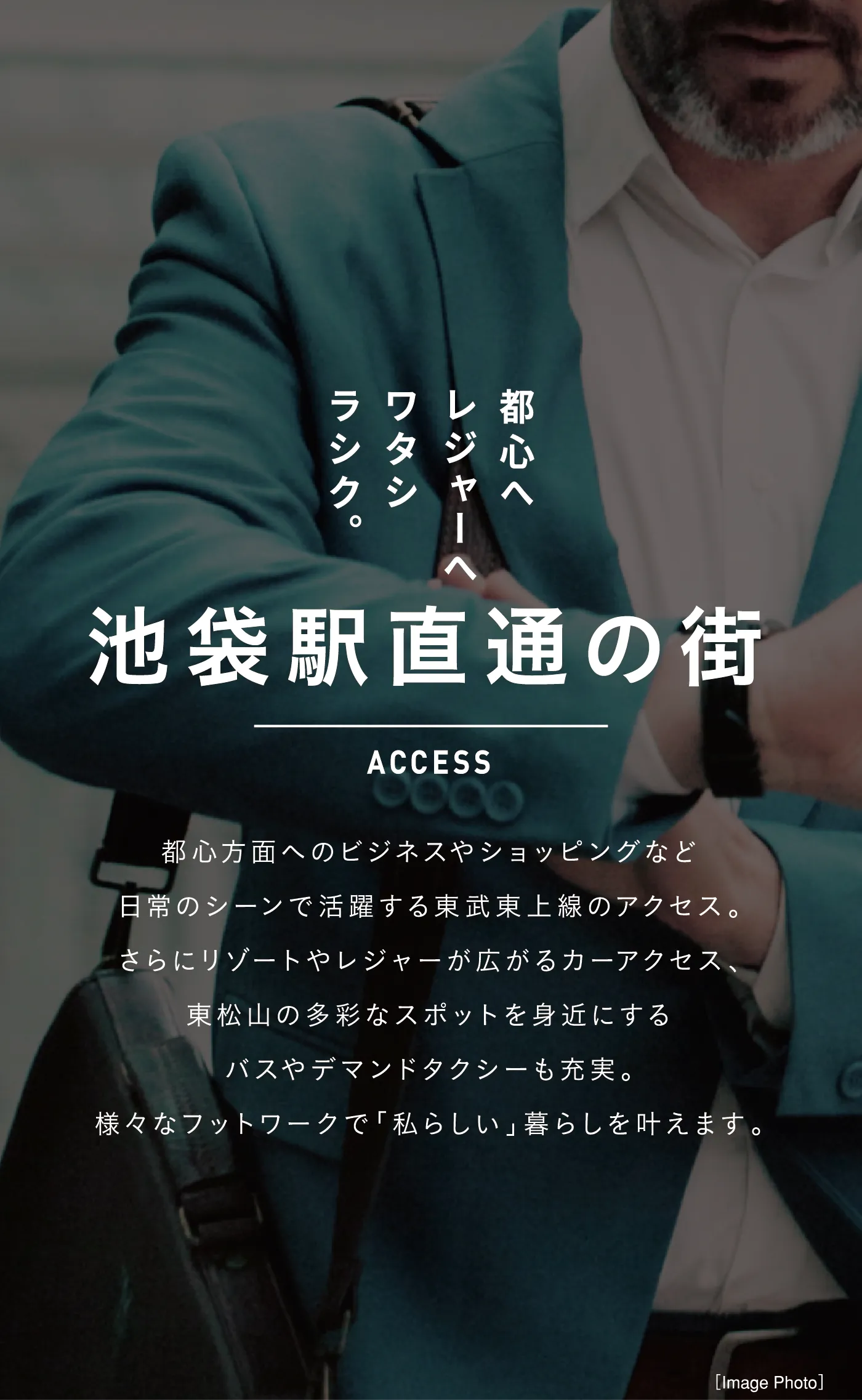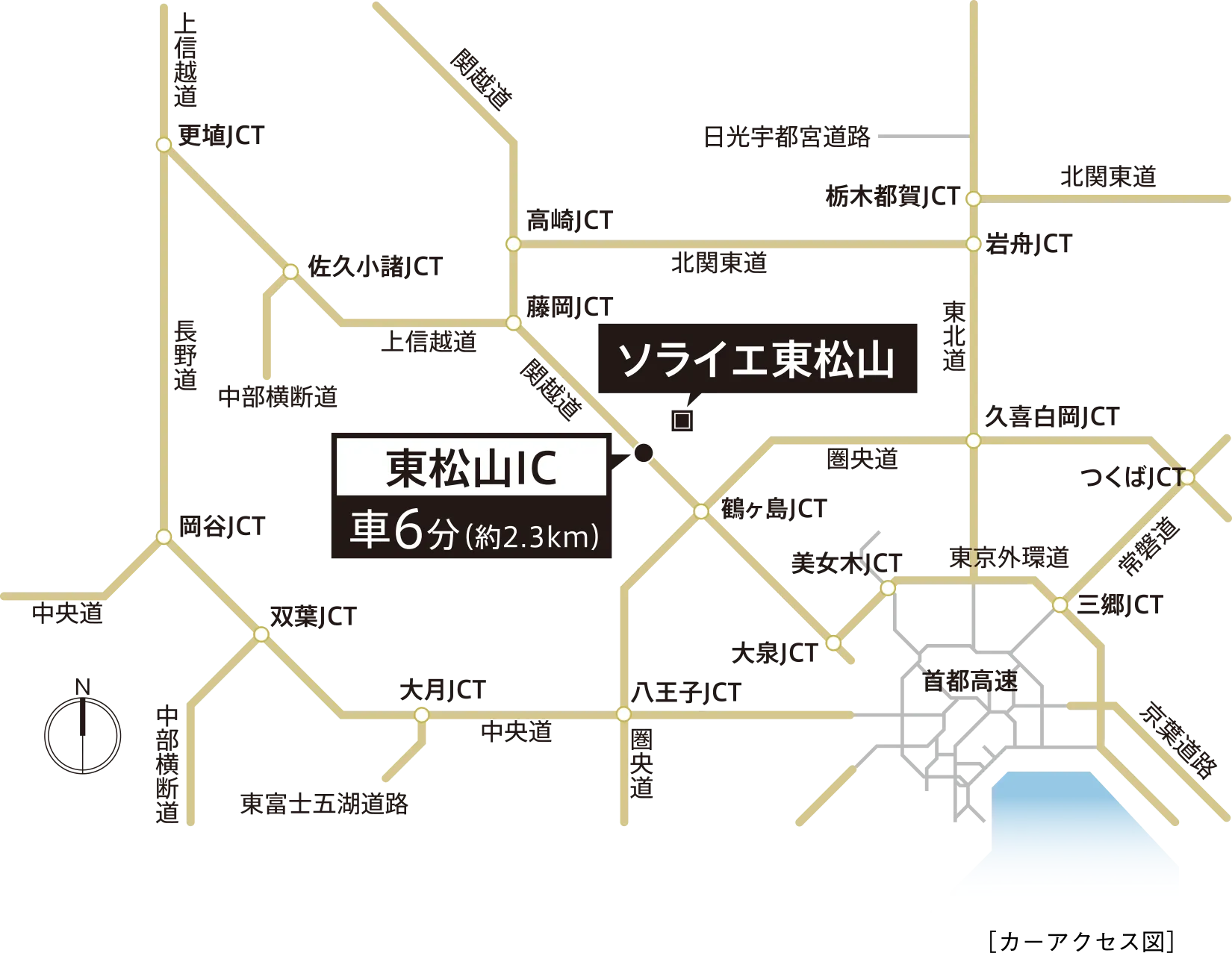 東松山ICへ約2.3km。各方面へのカーアクセスも快適で、軽井沢や御殿場などのリゾート、都心や湾岸方面へのレジャー・ショッピングなどがスムーズ。ライフスタイルがいっそう広がります。