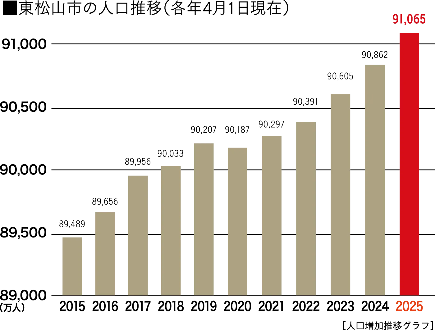 2015年に約8.9万人だった人口が2019年に9万人を達成し、人口増加が続く東松山市。この街が生活の舞台に選ばれていることを示す結果となっています(※2)。