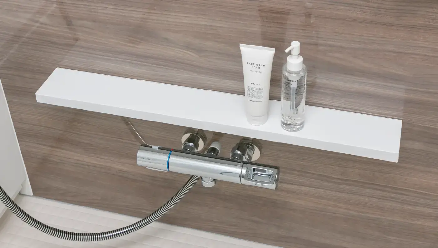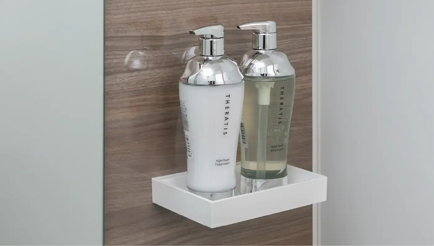 浴室内の壁面に収納トレイを設置。シャンプーやボディソープなどがすっきり収納できます。