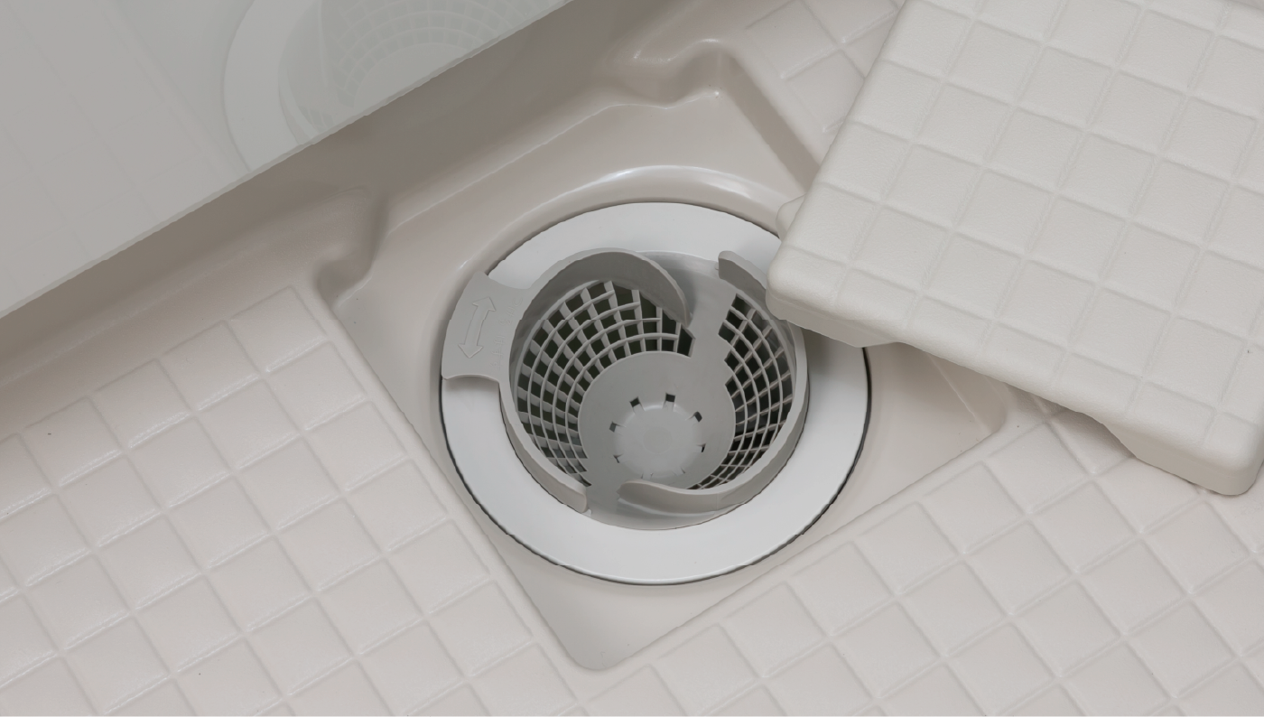 汚れが澑まりやすい排水口周りの金属をなくした、お手入れしやすい構造です。
