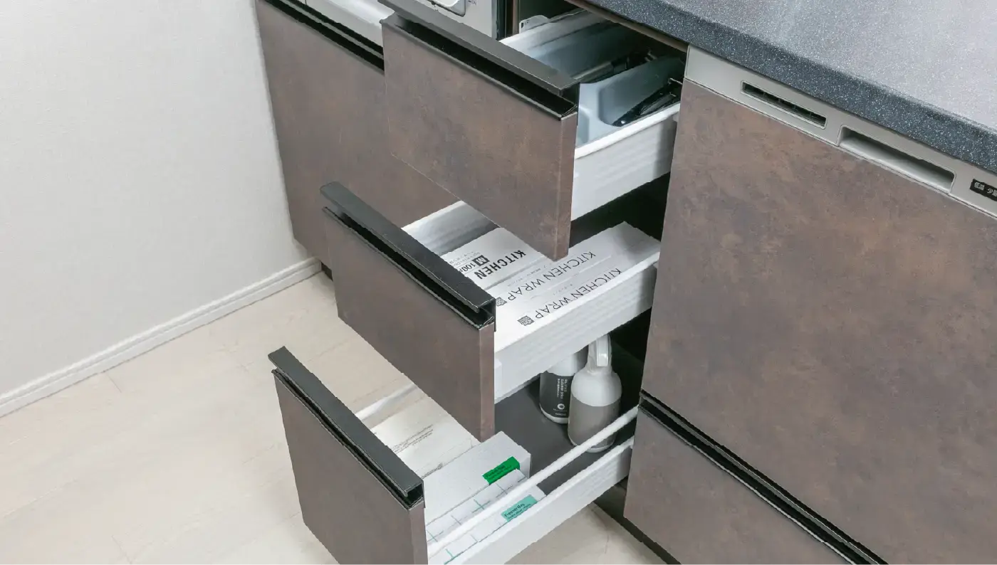 自動で洗浄から乾燥までをこなすビルトイン食器洗浄乾燥機を装備。食器の出し入れも簡単なフルオープンスライドスタイルです。ストリーム除菌洗浄で洗うと同時にしっかり除菌も行います。
