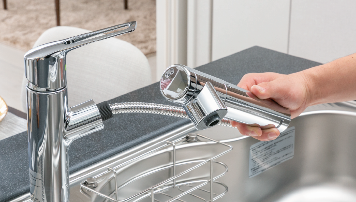 浄水と原水が簡単操作で切替可能。ヘッド部分を引き出して使うこともできます。