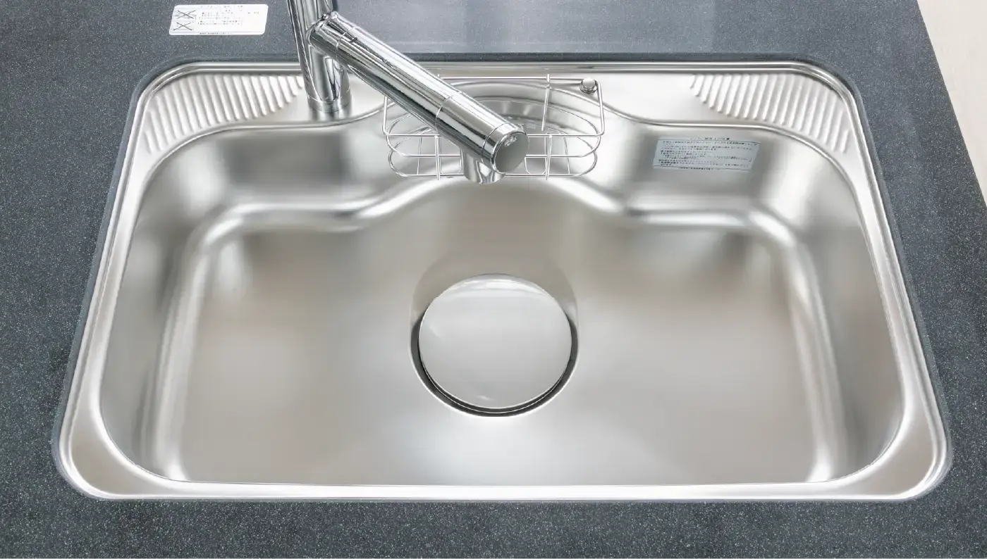 大型の食器も洗いやすいワイドなシンク。水はね音を軽減する低騒音の仕様となっています。