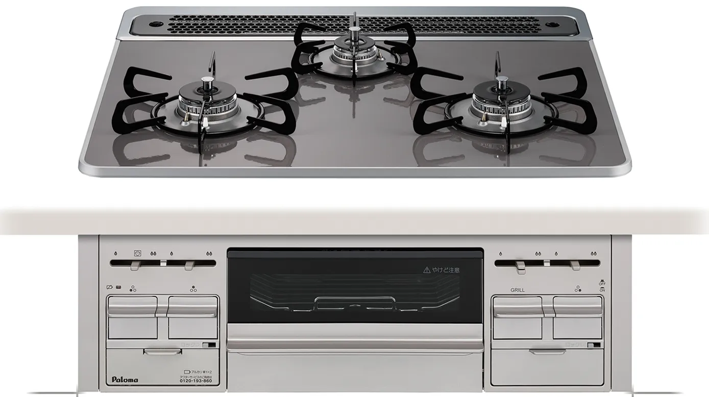 インテリア性に優れ、吹きこぼれなどもサッと一拭きできるハイパーガラストップコンロ。温度調整や炊飯など便利な機能を搭載しています。3口なので効率よくお料理できます。