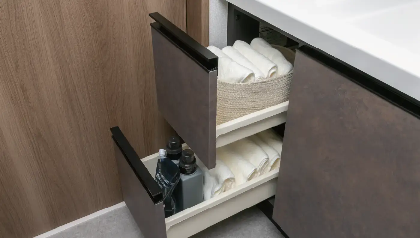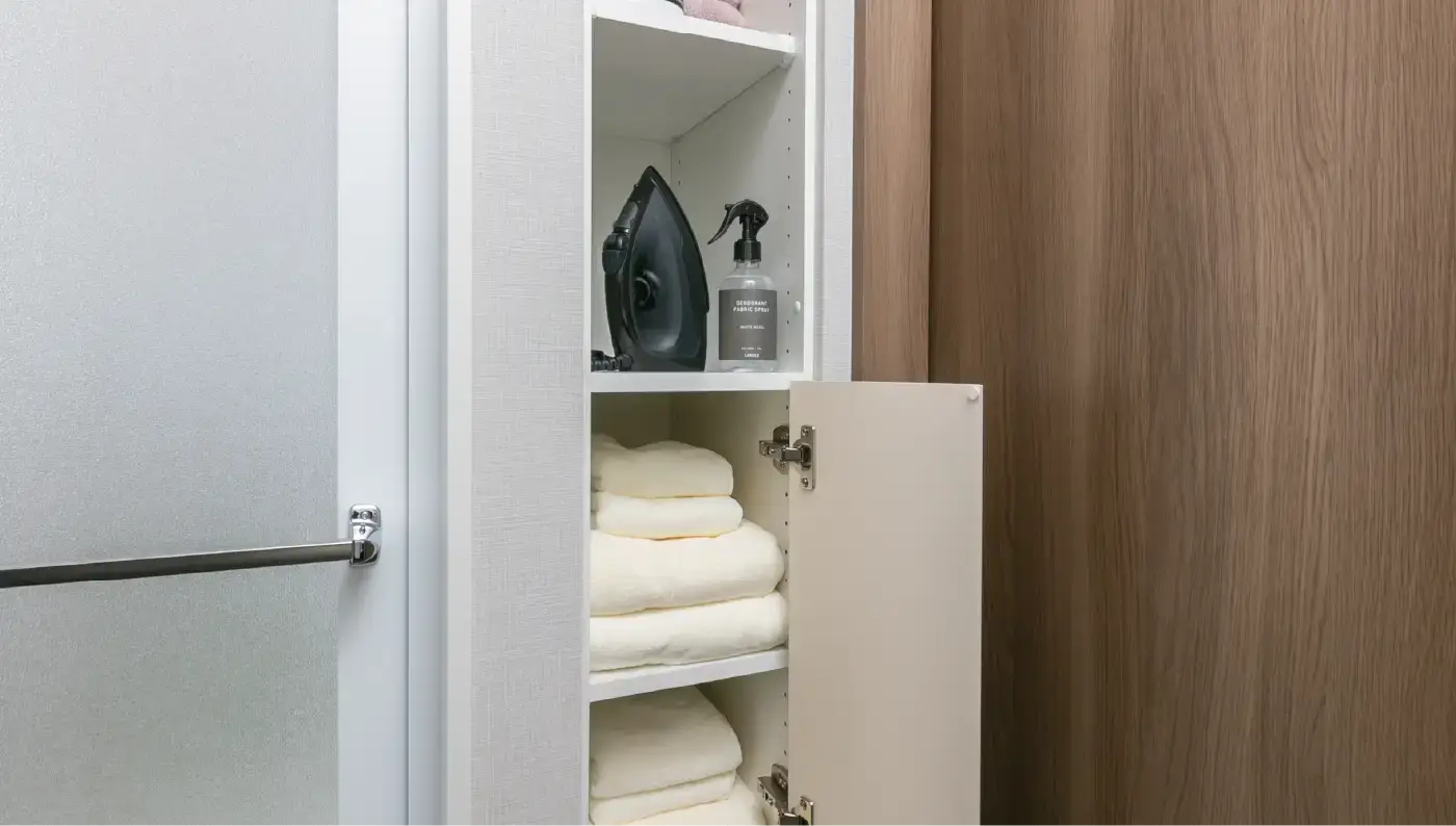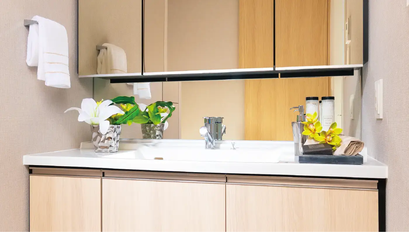 毎日使う空間だからこそ、使いやすさと快適さを。使い勝手の良さと空間をすっきりさせる充実のパウダールーム、機能充実のウォシュレットを備えたレストルームをご用意しました。