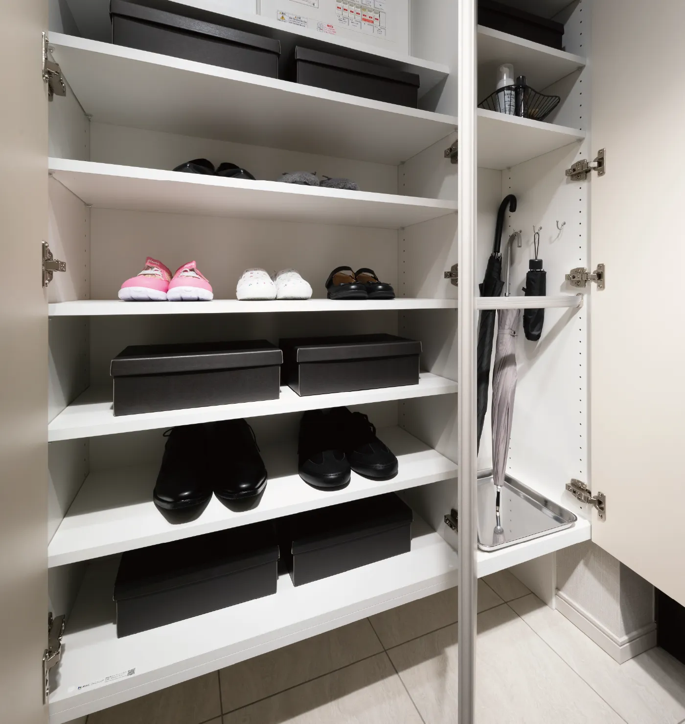 鍋などの大きなものも取り出しやすい開き戸タイプの収納スペースです。