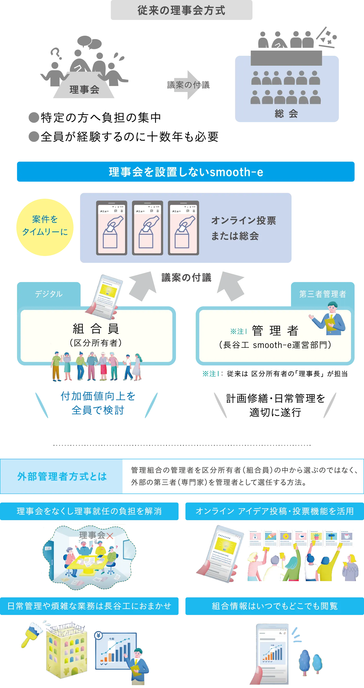 お住まいの方にとっては手間となっていたマンション管理。そのあり方を変えるのが「smooth-e」です。今注目の外部管理者方式をベースにデジタル技術を活用した、新たなマンション管理サービスです。