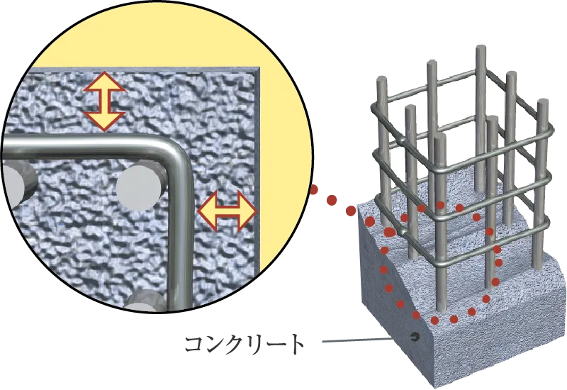 主要構造部のコンクリート柱には、工場であらかじめ溶接された溶接閉鎖形帯筋を採用。一般的な帯筋を用いた場合に比べ、より粘り強さのある構造となります。(一部基礎部を除く)