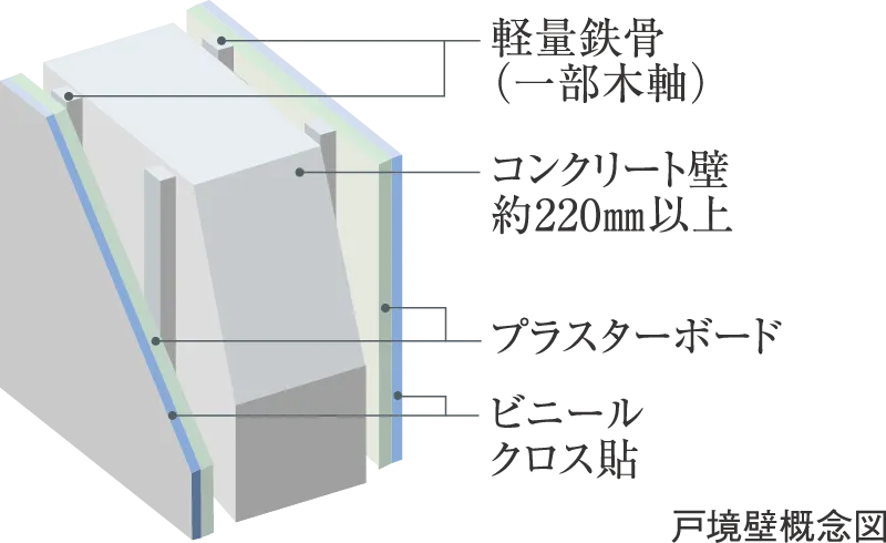 戸境壁は約220mm以上を確保し、耐久性とともに遮音性を高めました。また、外壁は約150mm以上のコンクリート壁または約100mmのALCを採用しています。