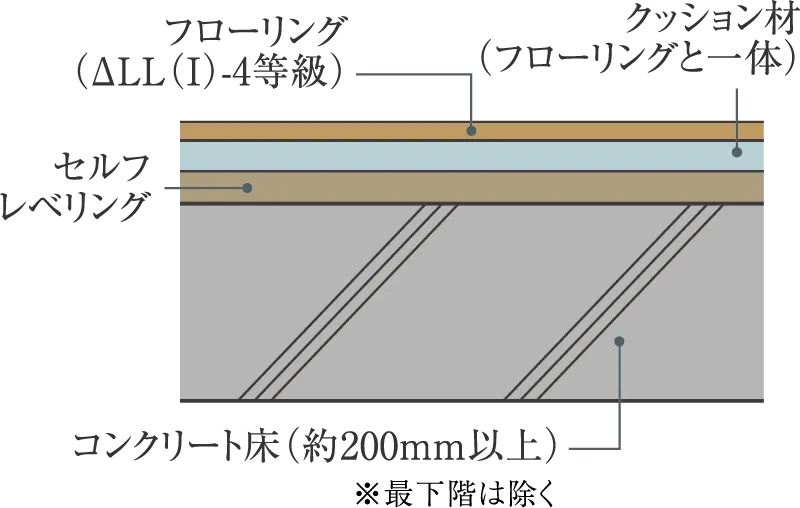床には遮音性に優れたΔLL(1)-4等級フローリングを採用することで、下階へ伝わる生活音を軽減。暮らしやすい住空間を追求しています。