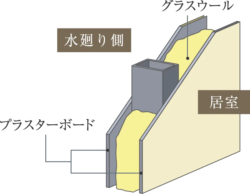 居室に直接面する水廻りの間仕切り壁は、プラスターボードを貼り込み、プラスターボード間にグラスウールを充填し、遮音性を高めています。