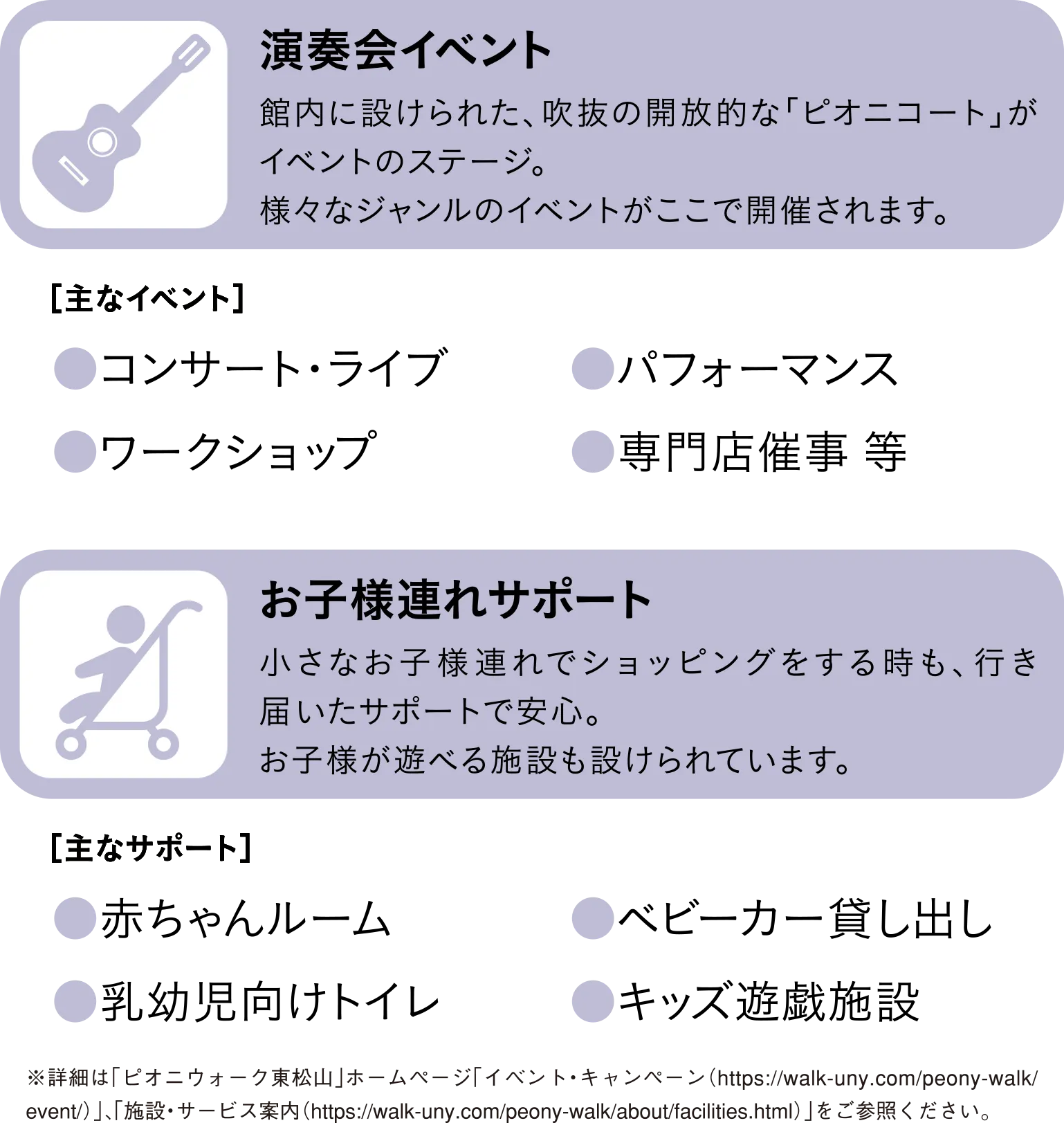 「ピオニウォーク東松山」では気軽に楽しめるライブや演奏会から専門店催事など様々なイベントを開催。お子様連れの方に嬉しいサポートも充実し、家族のショッピングをさらに楽しくしてくれます。