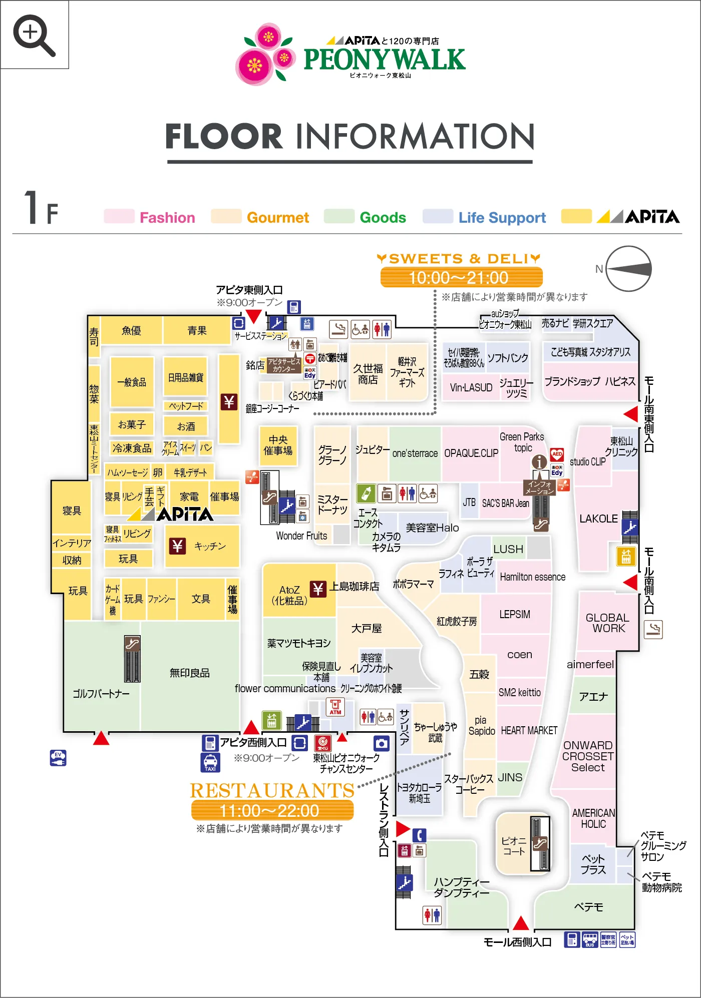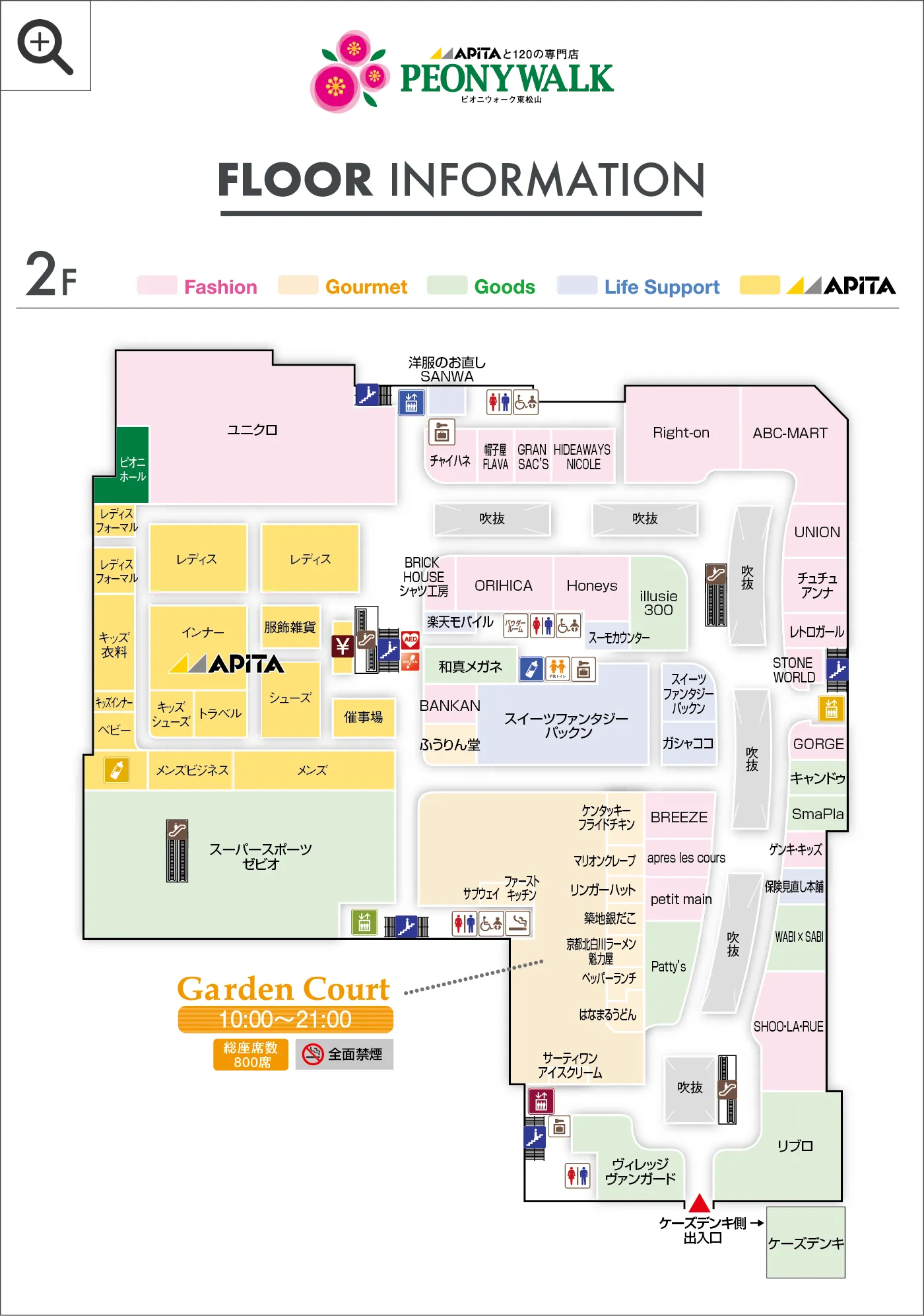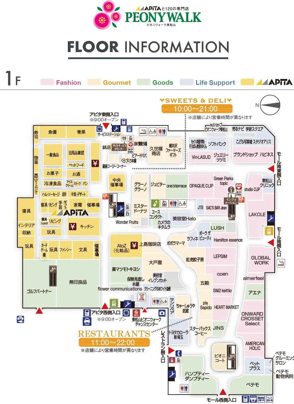2つのフロアで構成される「ピオニウォーク東松山」。1階には食品や生活用品を豊富に揃えたアピタと個性豊かなアパレルブランド、レストラン街などが集積。2階には憩いの場としても便利なフードコートなどが揃っています。