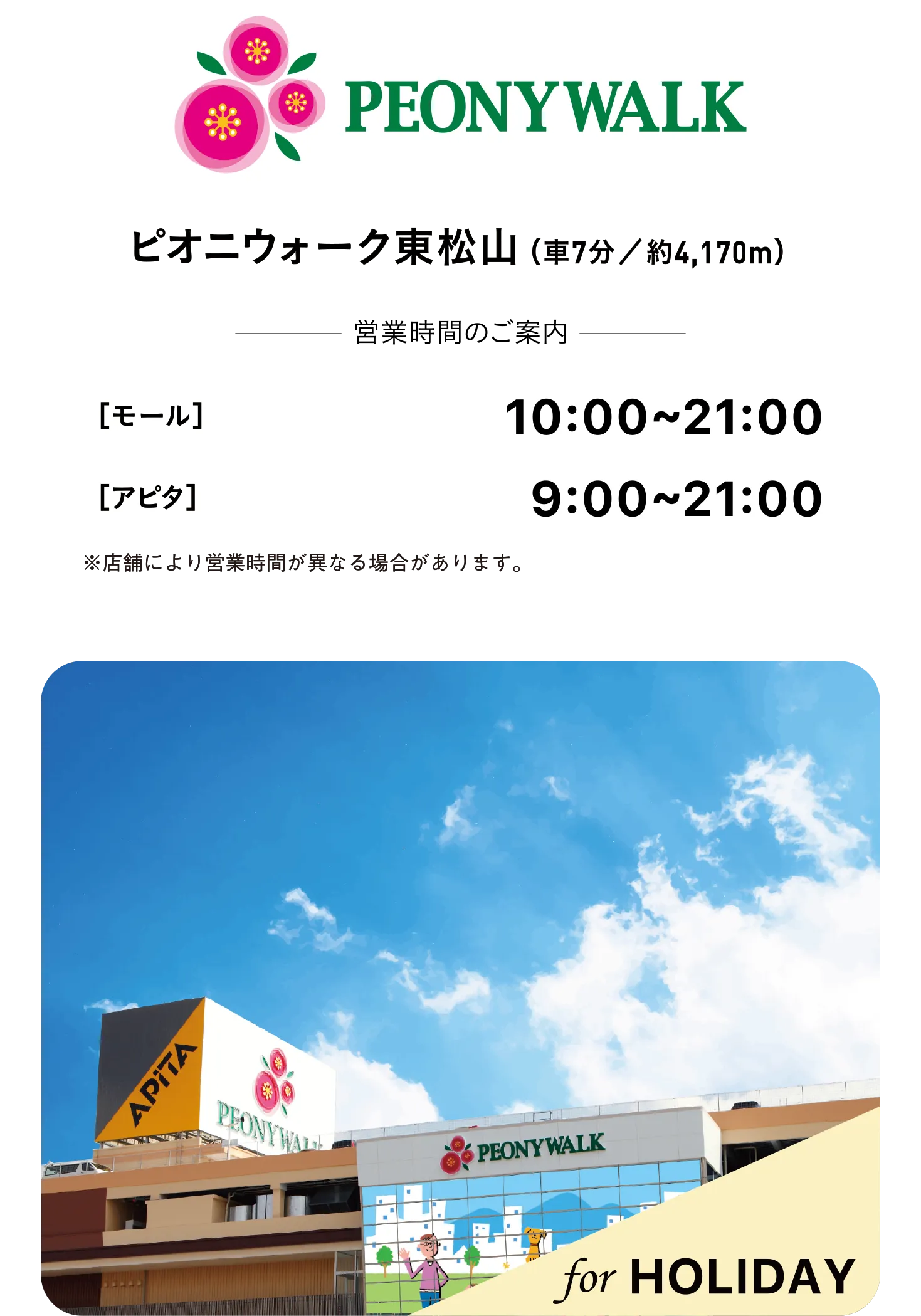 「ピオニウォーク東松山」は「しあわせのある暮らし」をコンセプトとするショッピングモール。スーパーマーケットのアピタと約120の個性豊かな専門店が集まり、幅広い品揃えで地域に愛されています。