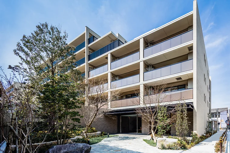 マンション敷地の周辺にはゆとりを感じる歩道状空地を設置し、既存樹とともに整備することで街との一体感を生み出しました。敷地内は地域に根付いた樹木や石材を取り入れることで、成増の美しい風景を生み出し、街から住まいへと心地よくつなぎます。