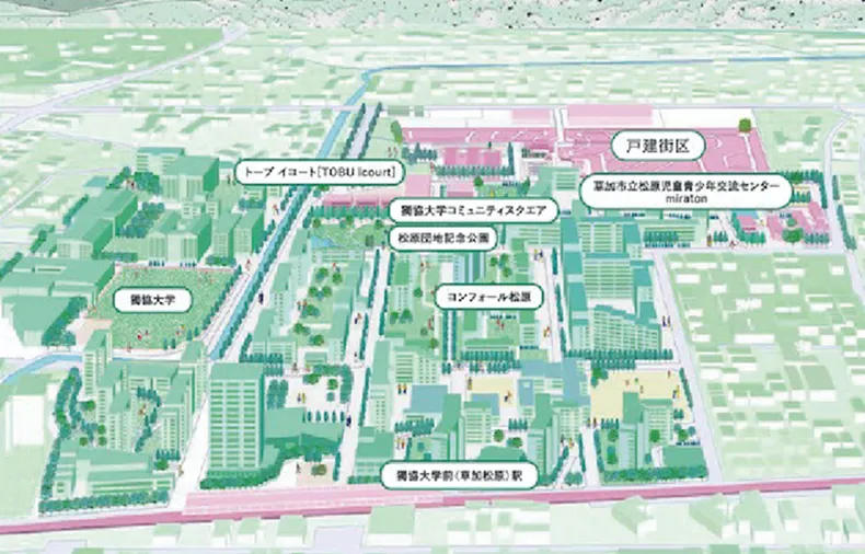 東武鉄道は、埼玉県草加市、獨協大学、独立行政法人都市再生機構東日本賃貸住宅本部、トヨタホーム(株)の5者で埼玉県草加市の獨協大学前<草加松原>駅西側地域における産官学連携によるまちづくりについての協定を締結し、多世代が繋がり、学び、誰もが活き活きと暮らせる未来を育む「WELL BIND(ウェルバインド)」をコンセプトに各社が連携を図っています。