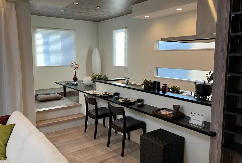 さらに、壁をなくしたキッチンや、柱を室外に出す設計により、視覚的にも機能的にもゆとりある空間を追求しています。※物件により異なります。