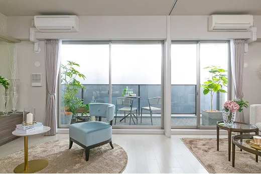 2.5m以上の天井高や連窓サッシの明るさ、奥行き2mのガラス手摺バルコニーの抜け感が、室内にのびやかなひろがりを生み出します。