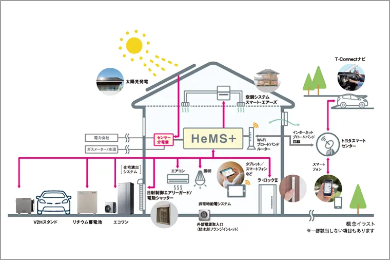 戸建街区の分譲住宅では、断熱性の高い住まいをベースに、高効率エアコンやLED照明などの省エネシステム、太陽光発電をはじめとする創エネシステムと、それらをコントロールするHEMSを活用。
